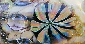 Application of the flower murrini is a little tricky as well. With traditional murrini you want the stripes on the outside to point toward the center creating a ‘spoked’ pattern (like a bicycle wheel). With flower murrini you use the heat of the flame and special metal tools to help push the petals outward, as a blooming flower would look. However, when heat is applied to these little murrini chips the glass has a strong desire to curl inward toward the center – so careful heat control must be used along with the use of the tools to achieve the desired, natural open-flower look.