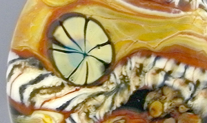 This cane is then cross-cut into slices that are individually applied to lampwork beads to create tiny, beautiful intricate patterned designs such as the one seen above.