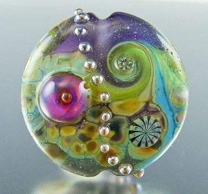 This journey begins with embedding three dimensional objects in glass as in this organic floral bead. This style bead is created in several parts which are then carefully assembled to make the final piece.