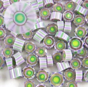 I have been a busy bee making lots of murrini lately. I really enjoy making the canes – I think it’s the excitement of layering color after color, anticipating the ‘big pull’, and then the final ‘ahhh’ moment when I snip the long cane for the first time to see my miniaturized design inside.