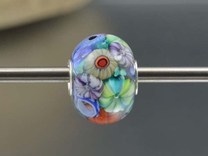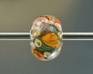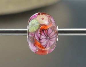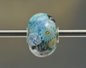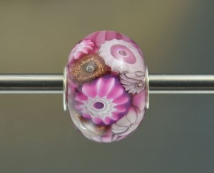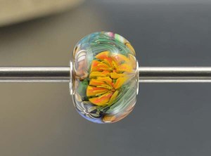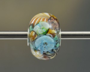 With the right type of flame, the silver in the silver glass is brought to the surface of the bead causing it to develop a slightly metallic sheen. Once I see that sheen I quickly and carefully capture that luster beneath a layer of crystal clear glass.