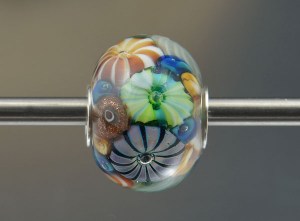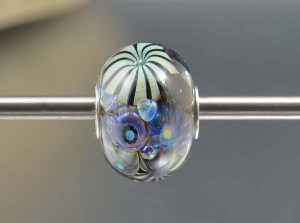 After encasing, and shaping and smoothing the bead, I apply three rows of alternating dots with a silver glass stringer pulled thin.